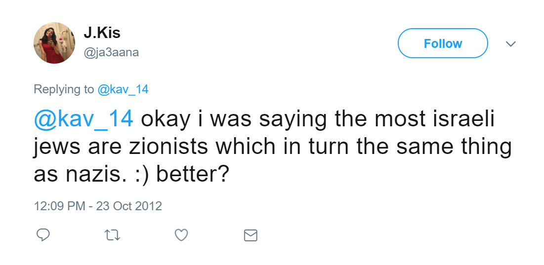 tweeted: “@kav_14 okay i was saying the most israeli jews are zionists which in turn the same thing as nazis. :) better?”