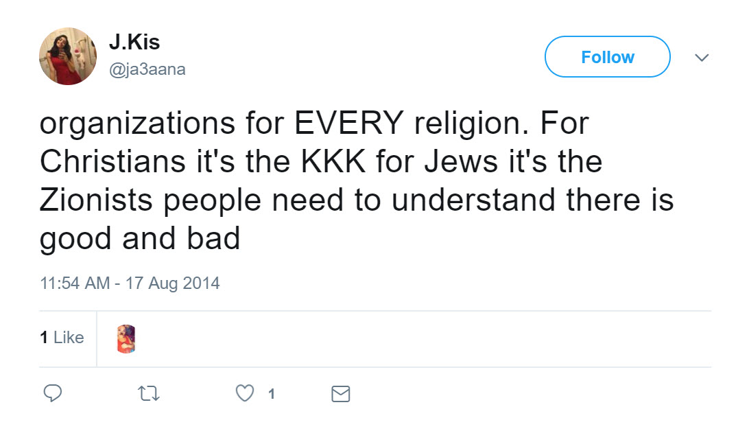 tweeted: “organizations for EVERY religion. For Christians it's the KKK for Jews it's the Zionists people need to understand there is good and bad.”