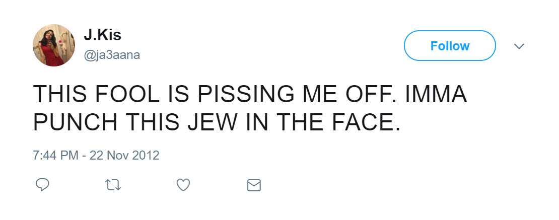tweeted: “THIS FOOL IS PISSING ME OFF. IMMA PUNCH THIS JEW IN THE FACE.”