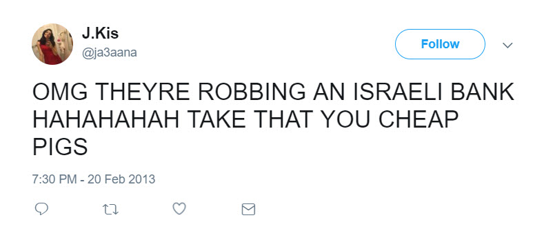 tweeted: “OMG THEYRE ROBBING AN ISRAELI BANK HAHAHAHAH TAKE THAT YOU CHEAP PIGS.”