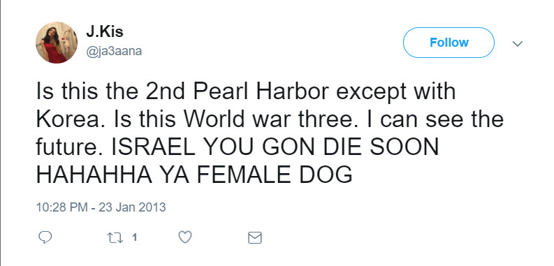 tweeted: “Is this the 2nd Pearl Harbor except with Korea. Is this World war three. I can see the future. ISRAEL YOU GON DIE SOON HAHAHHA YA FEMALE DOG.”
