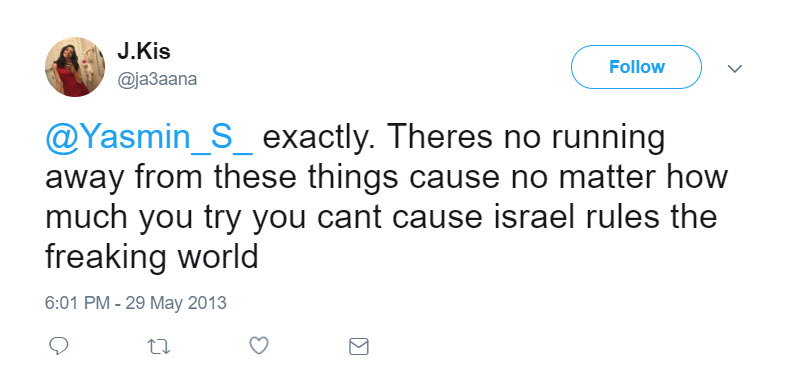 tweeted: “@Yasmin_S_ exactly. Theres no running away from these things cause no matter how much you try you cant cause israel rules the freaking world.”