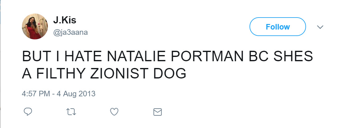 tweeted: “BUT I HATE NATALIE PORTMAN BC SHES A FILTHY ZIONIST DOG.”