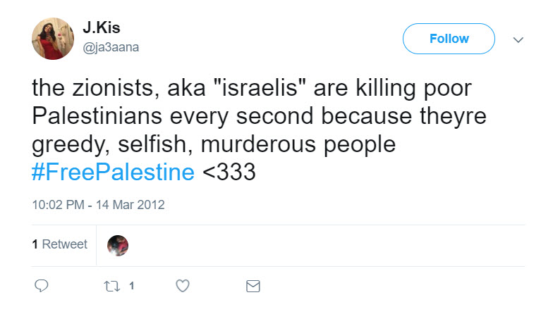 tweeted: “the zionists, aka ‘israelis’ are killing poor Palestinians every second because theyre greedy, selfish, murderous people #FreePalestine <333.”