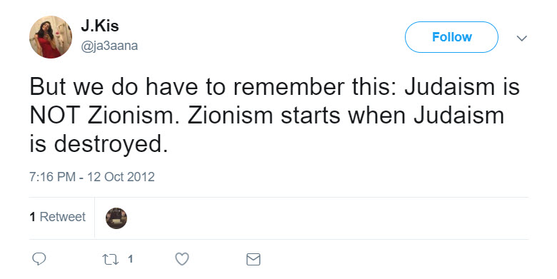 tweeted: “@kav_14 yes that is very true. Zionists and Jews are completley different :) Zionism starts where Judaism is destroyed.”