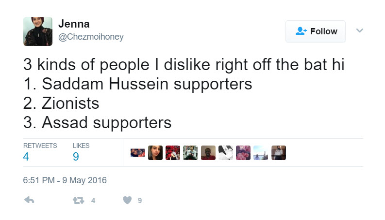 On May 9, 2016, Hassan tweeted: “3 kinds of people I dislike right off the bat hi 1. Saddam Hussain supporters 2. Zionists 3. Assad supporters.”