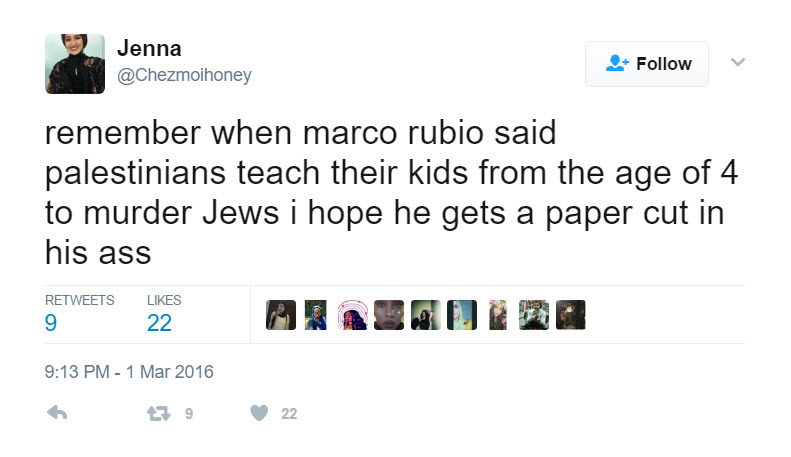 On March 1, 2016, Hassan tweeted: “remember when marco rubio said palestinians teach their kids from the age of 4 to murder Jews i hope he gets a paper cut in his a**.”