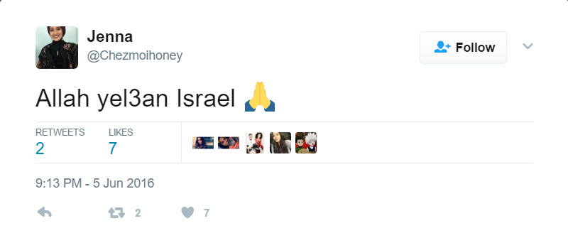 On the same day, Hassan tweeted: “Allah yel3an Israel [May Allah curse Israel].”