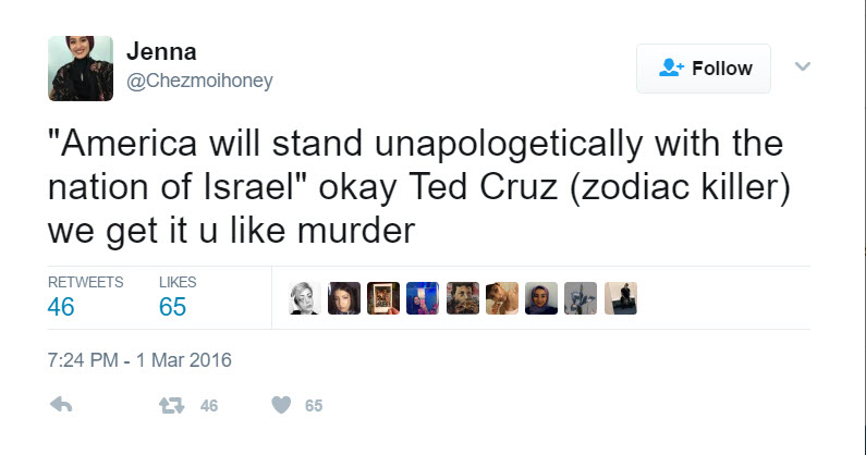 On the same day, Hassan tweeted: “‘America will stand unapologetically wit the nation of Israel’ okay Ted Cruz (zodiac killer) we get it u like murder.”
