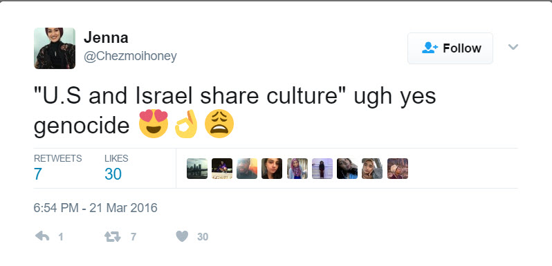 On March 21, 2016, Hassan tweeted: “‘U.S. and Israel share a culture’ ugh yes genocide.”