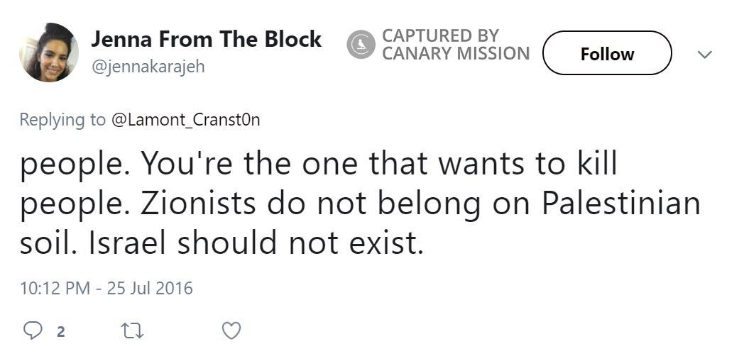 On July 25, 2016, Karajah tweeted: “...Zionists do not belong on Palestinian soil. Israel should not exist."