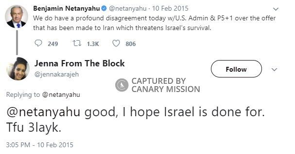 On Feb 11, 2015, Karajah tweeted: @netanyahu good, I hope Israel is done for. Tfu 3layk [I spit on you].” The tweet was in response to Israeli Prime Minister Benjamin Netanyahu's tweet: “the offer that has been made to Iran...threatens Israel's survival.”
