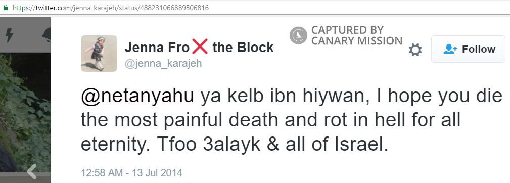 On July 13, 2014, Karajeh tweeted: “@netanyahu ya kelb ibnhiywan [you dog son of an animal], I hope you die the most painful death and rot in hell for all eternity. Tfoo 3alayk [I spit on you] & all of Israel.”On July 16, 2014, during Operation Protective Edge (OPE), Karajah tweeted: “get tf outta here with that bs. What Israel is doing is not ‘self-defence’. It's ethnic cleansing, it's genocide.”