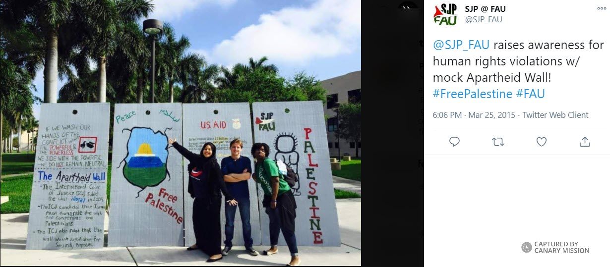 The tweet containing the photo read: “@SJP_FAU raises awareness for human rights violations w/ mock Apartheid Wall! #FreePalestine #FAU.”