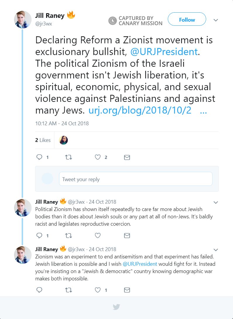 On October 24, 2018, Raney tweeted: “Zionism was an experiment to end antisemitism and that experiment has failed. Jewish liberation is possible and I wish @URJPresident would fight for it. Instead you're insisting on a ‘Jewish & democratic’ country.”