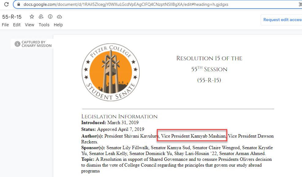 Kamyab Mashian demonized Israel and co-authored a Boycott, Divestment, Sanctions (BDS) resolution at Pitzer College (Pitzer) while serving as the 2018-2019 Vice President of Internal Affairs of the Pitzer Student Senate, the college’s student government.As of March 2022, Mashian’s LinkedIn page said he had been affiliated with the Pitzer Student Senate from 2015 to 2019, when he graduated. He also served as the 2017-2018 Secretary, a 2016-2017 Senator and was elected Sophomore Class Representative of the Pitzer Student Senate in Spring 2016.