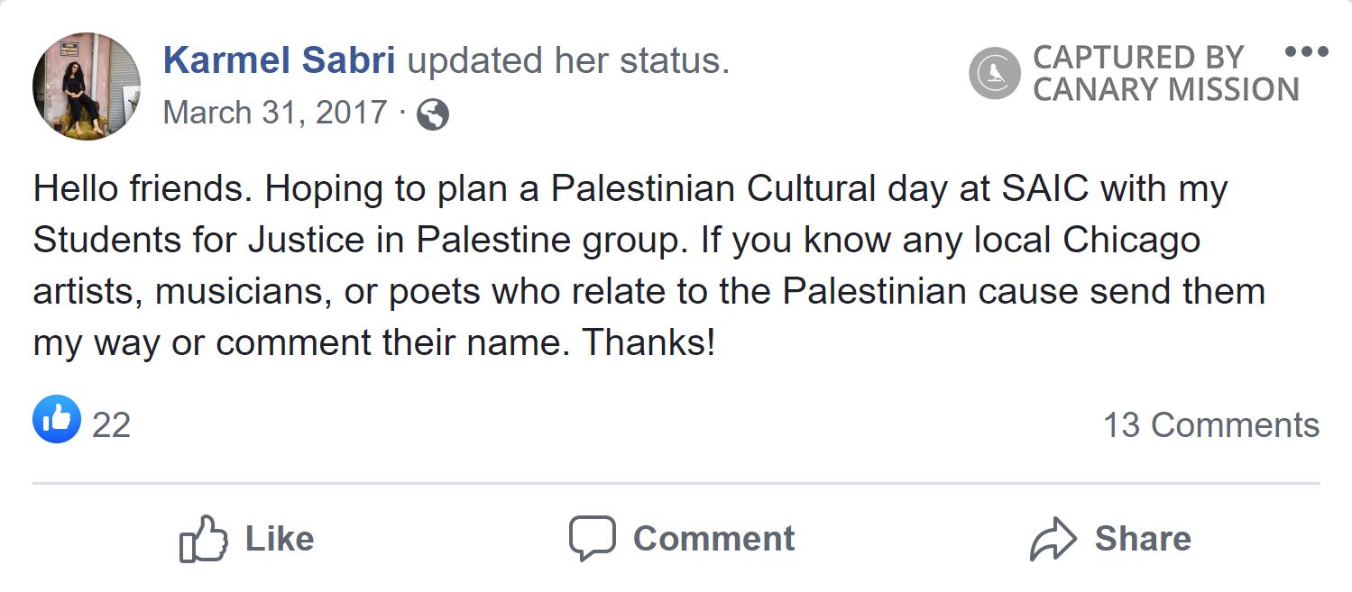 As of September 3, 2020, Sabri posted to her website under the SJP at SAIC section: “During my time at The School of the Art Institute of Chicago I became a leader in the Students for Juctice[sic.] for Palestine group on Campus.”