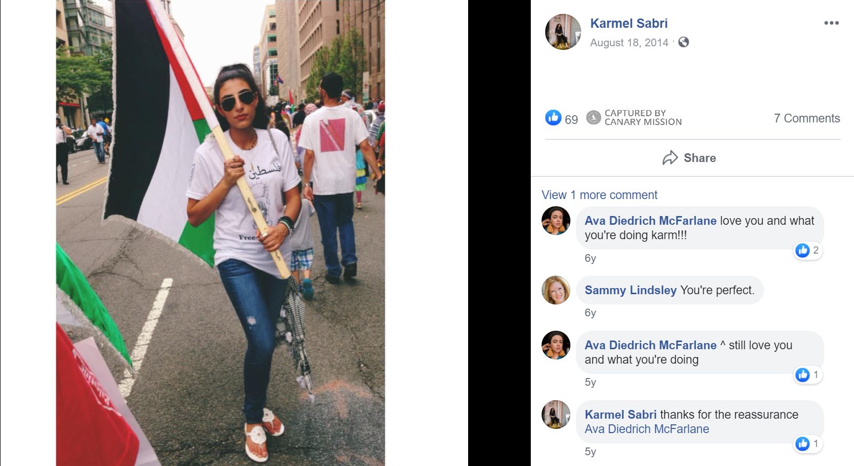 On July 13, 2014, during Operation Protective Edge (OPE), Sabri posted a photo to Facebook featuring herself and other anti-Israel activists participating in an anti-Israel protest, adding: “Take a stand against Zionism! We will not stop until innocent lives are no longer being taken and Palestine is free ◻️🔴◼️💚 This is not a two sided war…”Israel commenced OPE in July 2014 to stop rocket fire targeting Israeli civilians and to destroy Hamas attack tunnels.
