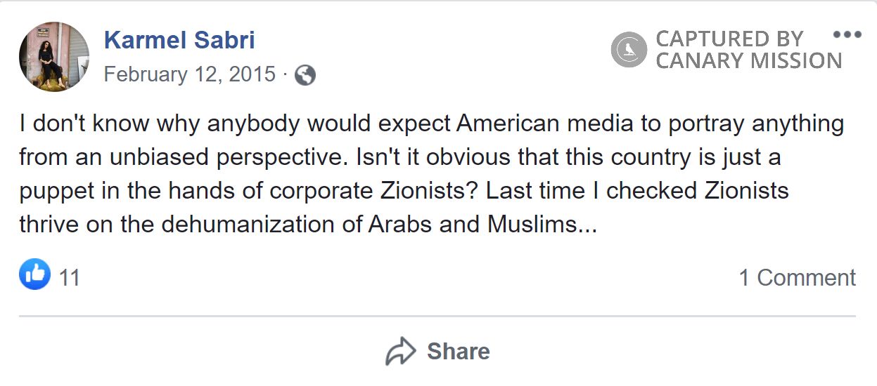 On February 20, 2015, Sabri posted to her Facebook page: “I don't know why anybody would expect American media to portray anything from an unbiased perspective. Isn't it obvious that this country is just a puppet in the hands of corporate Zionists?”