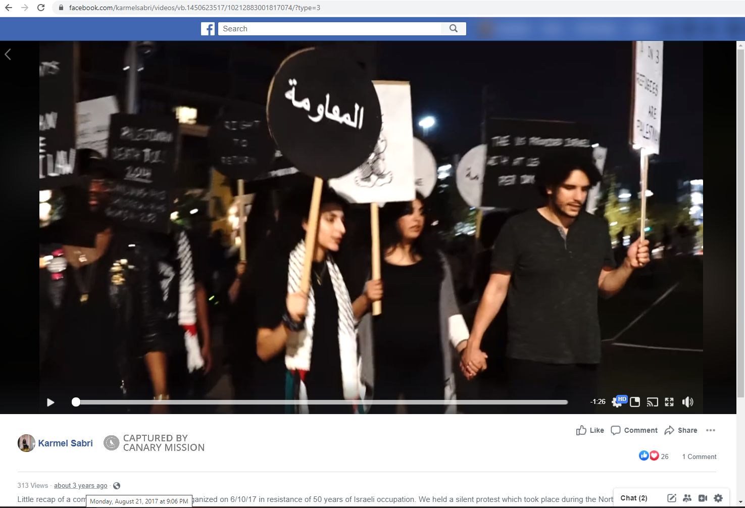 On August 21, 2017, Sabri posted to her Facebook page a video of a June 10, 2017 “community performance piece,” she organized “in resistance of 50 years [sic] of Israeli occupation.” The demonstration included a march and “throwing 50 porcelain grenades filled with olive seeds.”