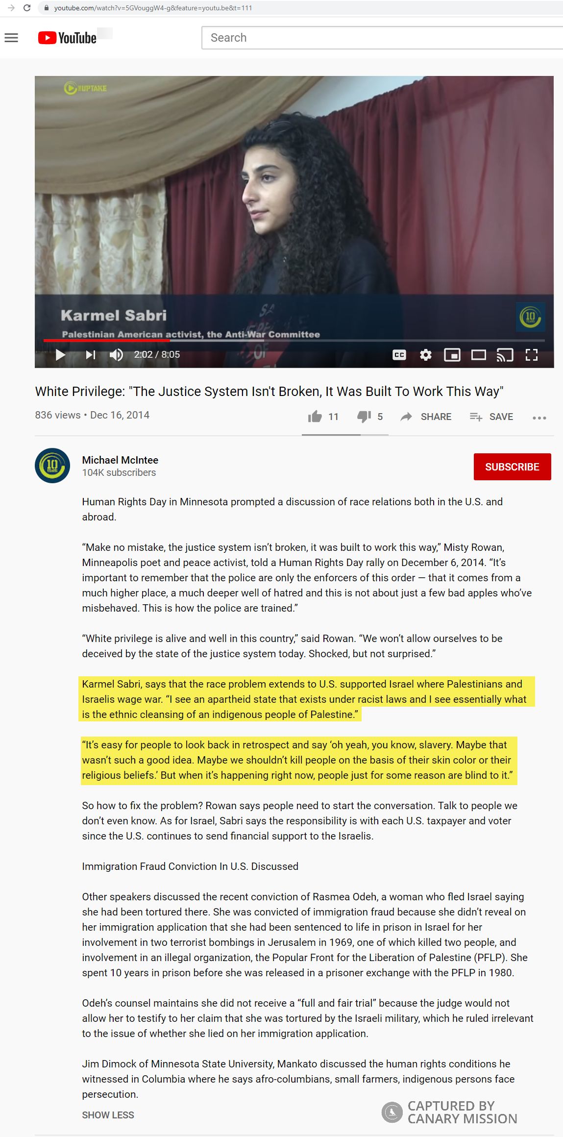 On December 6, 2014, Sabri spoke at a Human Rights Day rally in Minnesota. During her speech, Sabri suggested [00:02:30] that Israel killed people on the basis of their skin color and religious beliefs.
