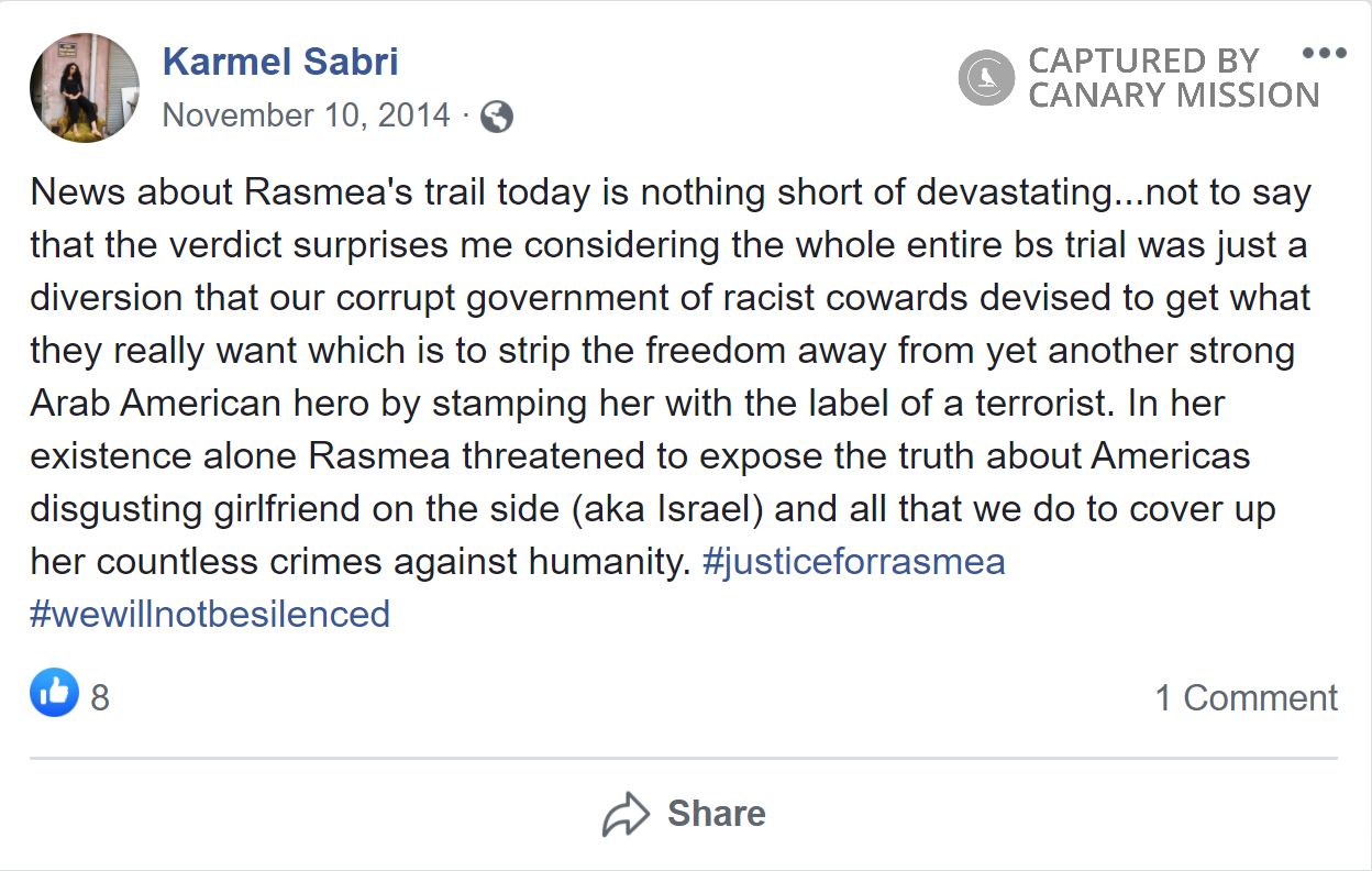 On November 10, 2014, Sabri posted to Facebook: “News about Rasmea's trail [sic.] today is nothing short of devastating...not to say that the verdict surprises me considering the whole entire bs trial was just a diversion that our corrupt government of racist cowards devised to get what they really want which is to strip the freedom away from yet another strong Arab American hero by stamping her with the label of a terrorist.”Sabri added: “In her existence alone Rasmea threatened to expose the truth about Americas disgusting girlfriend on the side (aka Israel) and all that we do to cover up her countless crimes against humanity. #justiceforrasmea #wewillnotbesilenced.”