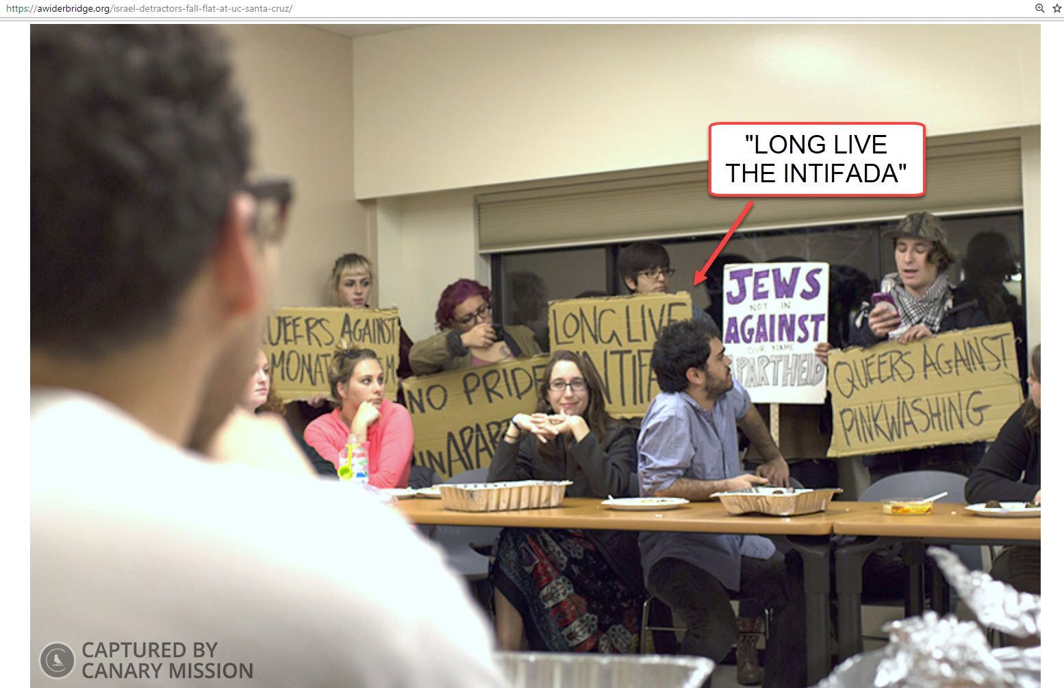In January 2015, UCSC SJP members violated the safe space of an LGBT campus event hosted by "A Wider Bridge". Hoisting a placard reading “LONG LIVE THE INTIFADA!” the demonstrators invoked,with approval, the wave of Palestinian Arab violence occurring in Israel that month. UCSC SJP members moved to the front of the room and imposed their message upon the audience while delaying the invited speaker from talking. UCSC SJP later posted a video inadvertently showing that its members lied when agreeing not to disrupt the event, as a condition of their admittance.