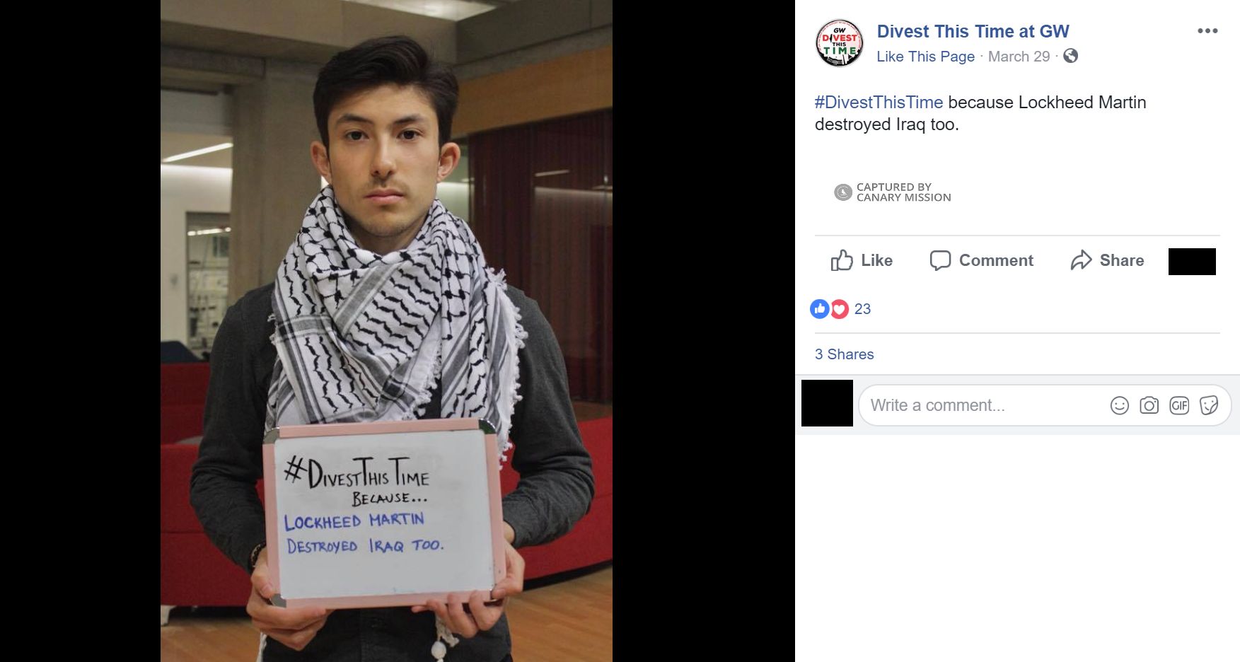 On March 24, 2018, student groups at GWU launched the second BDS campaign in two years; both were titled “#DivestThisTime.” Activists with Students for Justice in Palestine (SJP) at GWU (SJP at GWU) led both campaigns.On the campaign launch day, #DivestThisTime released a Facebook promotional video, in which activists alleged [00:01:23] that Israel has committed “crimes against humanity.” They also claimed [00:03:34] that Palestinians are “bombed every day” and blamed Israel [00:02:06] for police violence against black Americans in Ferguson, Missouri.