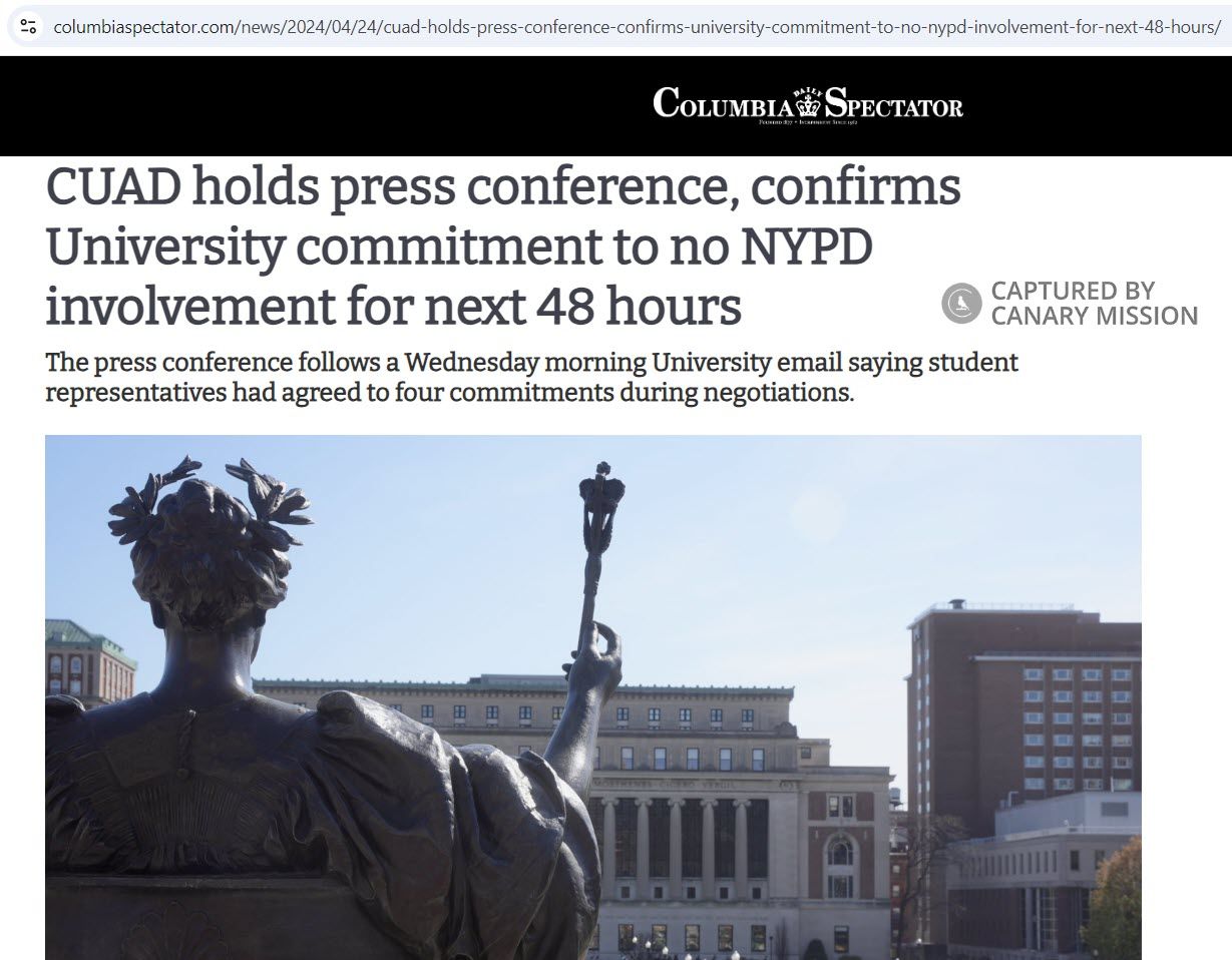 On April 17, 2024, Columbia students and anti-Israel activists set up a pro-Hamas “Gaza Solidarity Encampment” on the university's main lawn. Many participants were arrested and the encampment featured multiple violent incidents, including taking over a campus building and taking a university worker hostage.Activists protested Israel’s war against Hamas and demanded that Columbia “divest from companies and institutions that profit from Israeli apartheid, genocide and occupation…”