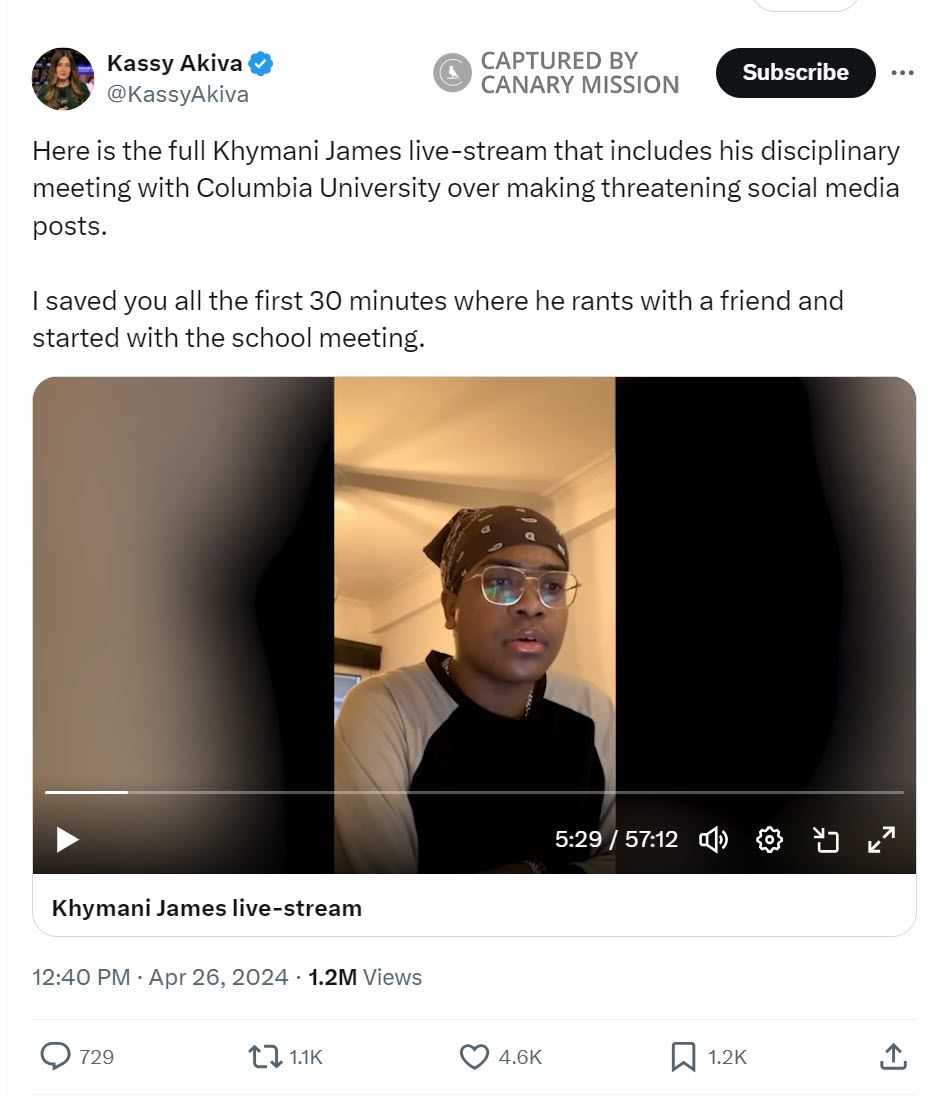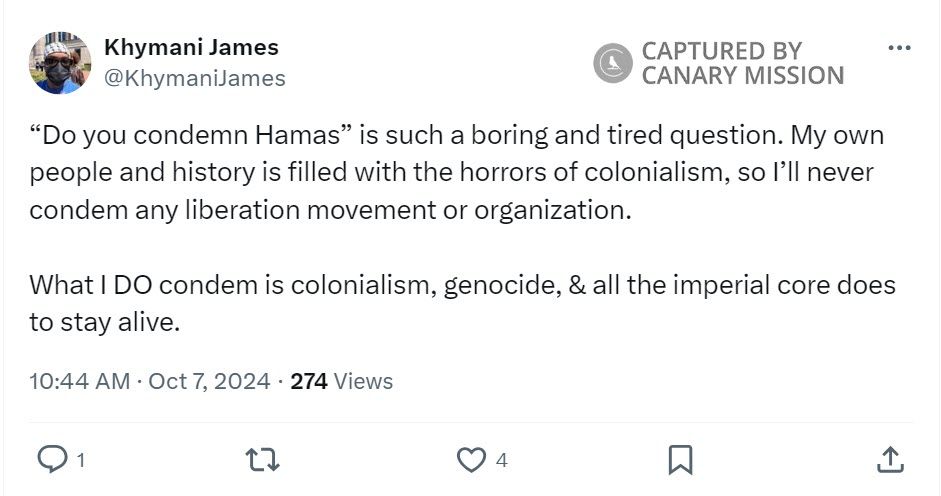 .”Khymani James’s Calling for Israel’s Destruction & Support for Hamas Terrorism