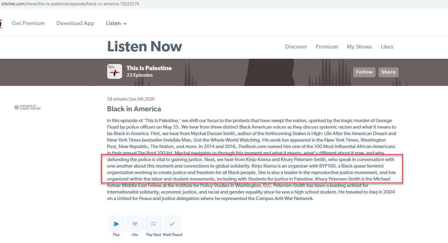 In the same June 5, 2020 podcast, Kiema also said [00:35:44]: “I was a student in Washington, DC, a college student, and I had friends who had traveled to Palestine and had sort of seen what was going on there and this is what motivated me to be involved with Students for Justice in Palestine because everything that they told me about what they witnessed, was, it just sounded like apartheid and segregation and also a lot of parallels to what Black people in the United States have experienced.”