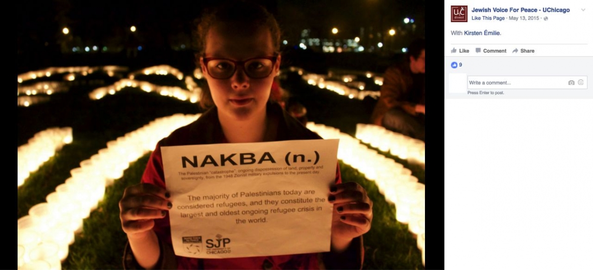 On May 7, 2014 — a day after Israeli Independence Day — SJP U of C posted photos of their protest in which Gindler participated. She stood alongside other SJP U of C and JVP UChicago members who alleged Israel committed "ethnic cleansing" in the 1948 Israeli War of Independence.