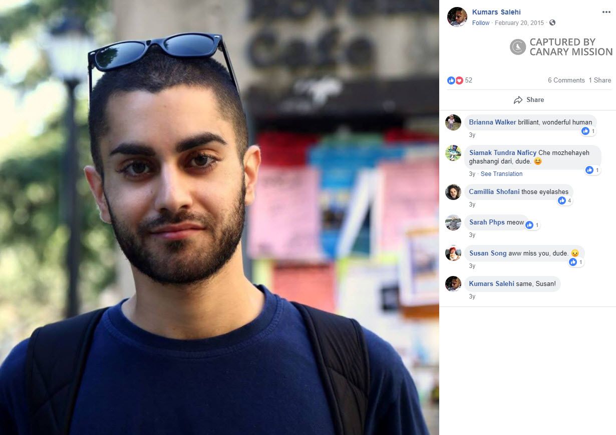 Kumars Salehi has spread hatred of Israel as a student activist with Students for Justice in Palestine (SJP) at New York University (NYU). Salehi was also a member of SJP at the University of California, Berkeley (UC Berkeley).Salehi is an advocate of the Boycott, Divestment and Sanctions (BDS) movement.