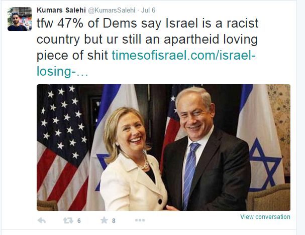 On July 6, 2015, Salehi tweeted: “tfw 47% of Dems say Israel is a racist country but ur still an apartheid loving piece of sh*t.”