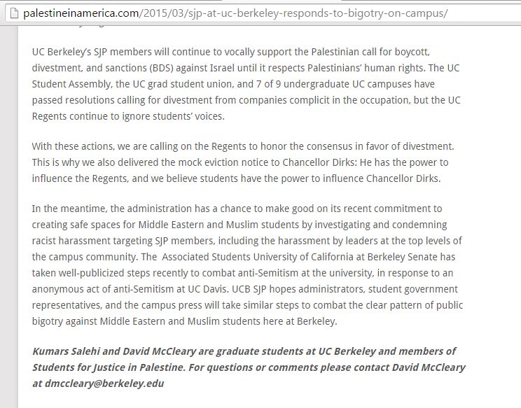 Salehi authored a January 26, 2015 article in the Berkeley Journal of Sociology titled: “BDS in the United States,” where he described: “BDS tactics act...to normalize the isolation of Israel on the level of public discourse by grounding the case for boycott ...rather than as a ‘conflict’ between comparable parties.”