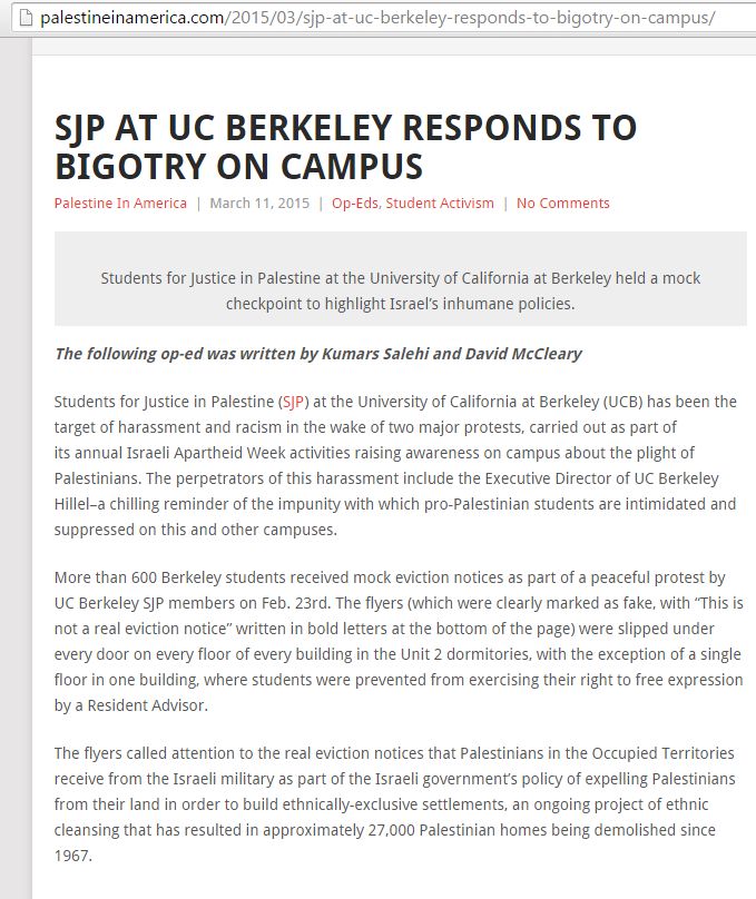 On February 26, 2015, Salehi shared audio from SJP UC Berkeley’s mock checkpoint set up in front of one of the University gates for Cal SJP’s 2015 Israeli Apartheid Week (IAW) at UC Berkeley.