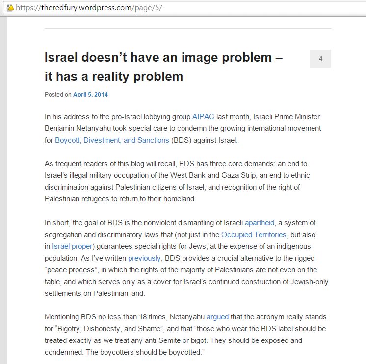 Salehi wrote a blog called: “The Red Fury” between December 2011 and April 2015.On March 23, 2013 he asserted that “shared values" between Israel and the U.S are "militarism" and "apartheid."