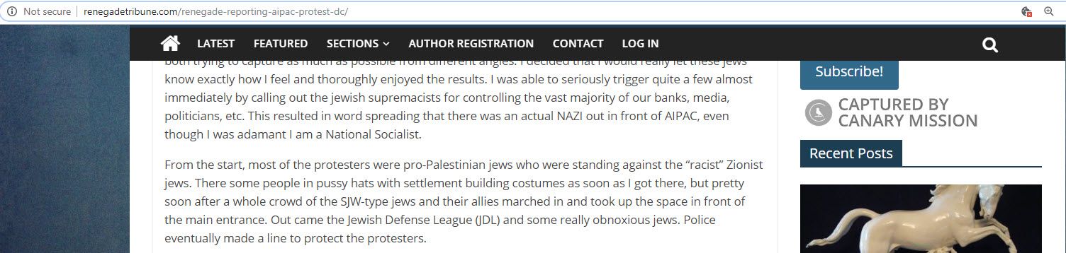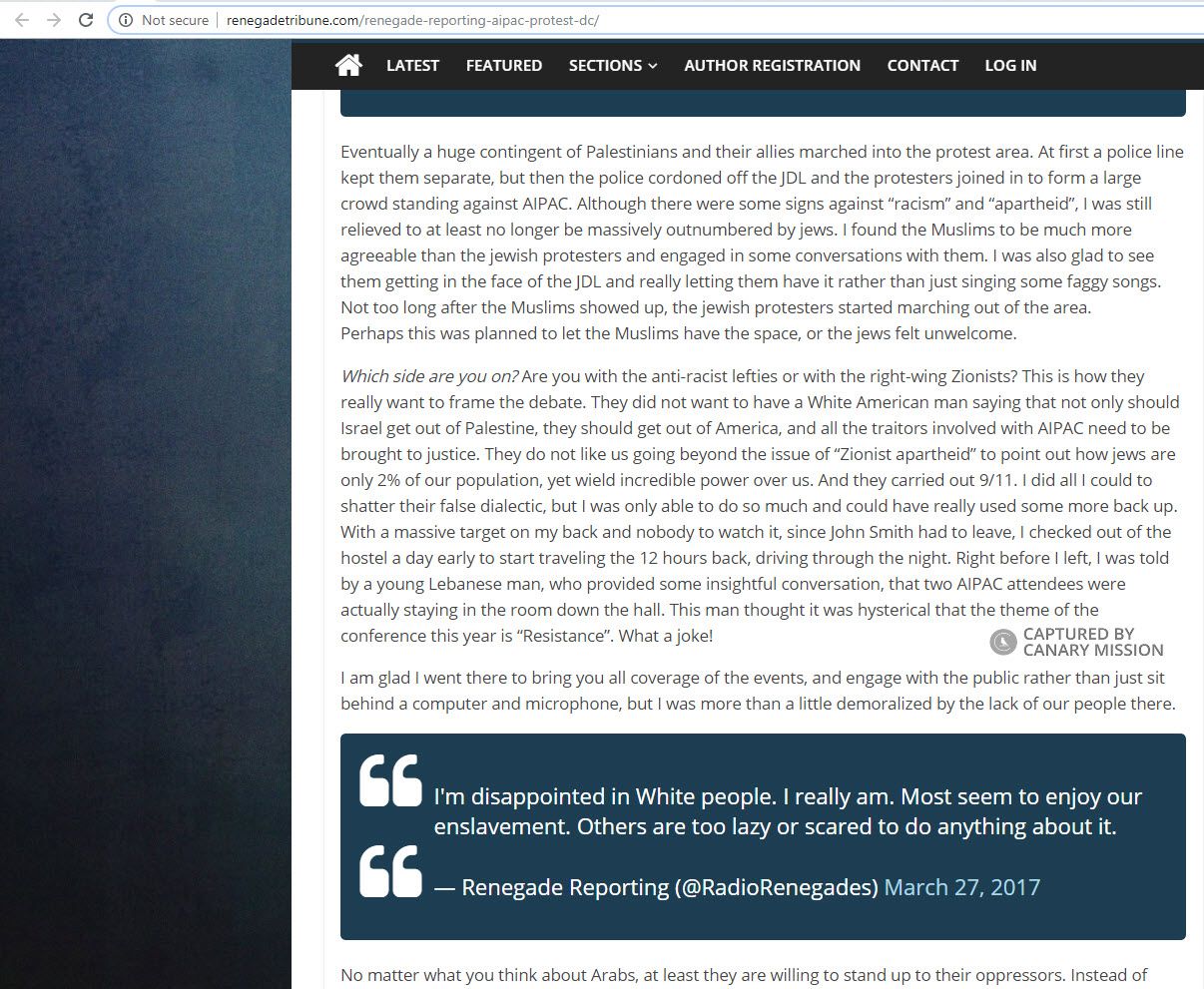 On March 28, 2017, Hunt wrote an article documenting the event for his website, titled: “Renegade Reporting from the AIPAC Protest in DC.”