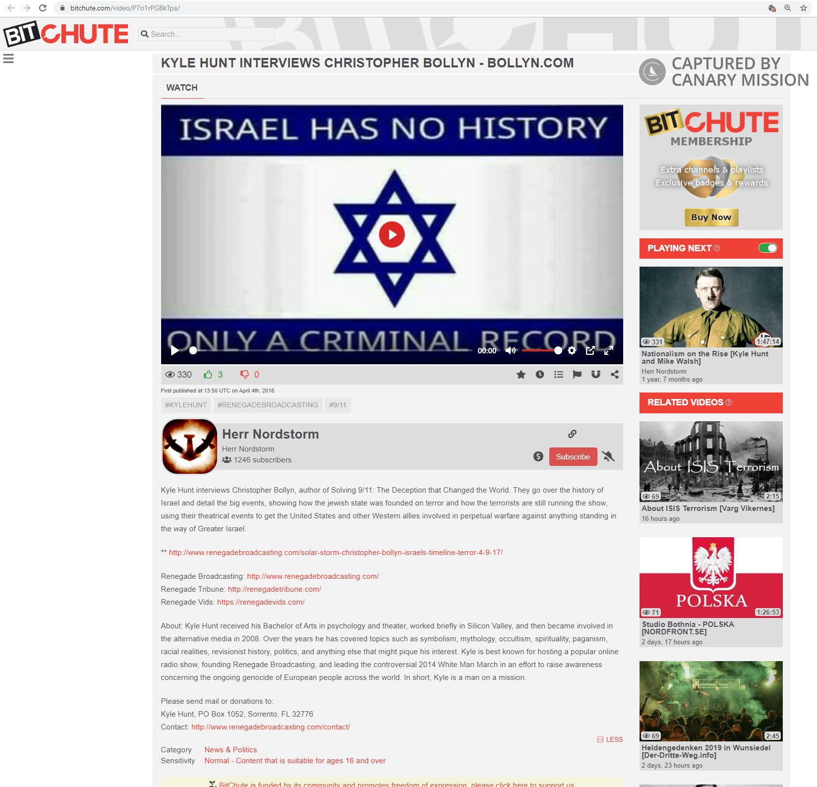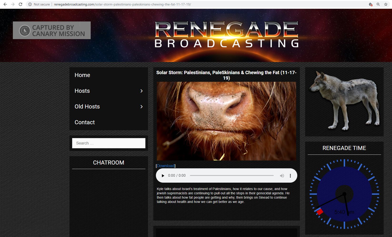 On November 17, 2019, Hunt aired a podcast on Renegade Broadcasting, titled: “Solar Storm: Palestinians, PaleSkinians & Chewing the Fat.”The podcast description said: “Kyle talks about Israel’s treatment of Palestinians, how it relates to our cause, and how jewish supremacists are continuing to pull out all the stops in their genocidal agenda.”