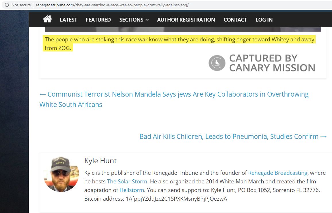 Hunt wrote in his Renegade Tribune article: “Of course the outrage is supposed to be focused against White oppression, rather than ZOG’s enforcement agencies.” Hunt added: “The people who are stoking this race war know what they are doing, shifting anger toward Whitey and away from ZOG.”