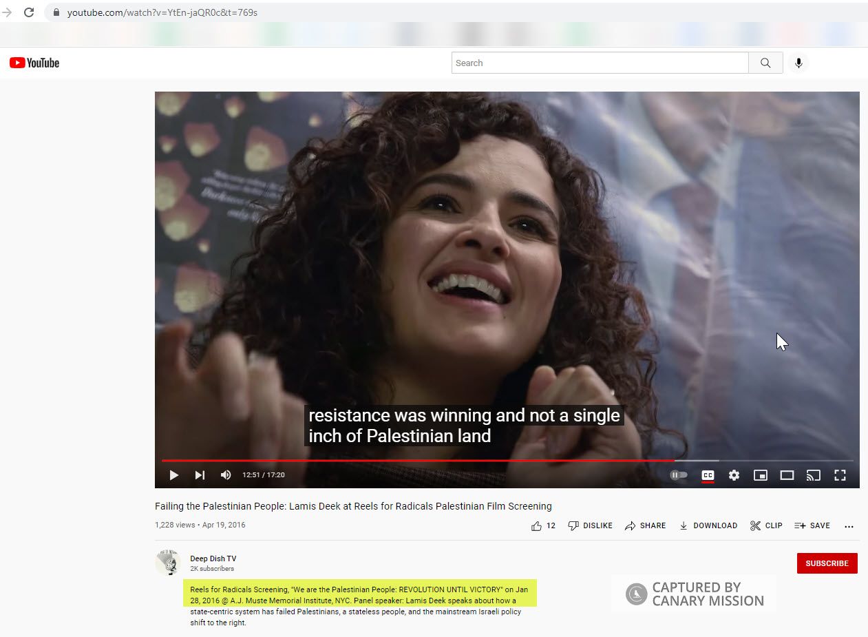 On January 28, 2016, Deek said [00:12:49]: “Not a single inch of Palestinian land has ever been liberated by any peace agreement. It has always only been liberated by resistance.”On April 1, 2018, Deek tweeted: “It should be clear.....return will happen by all means made necessary by the colonizer.”