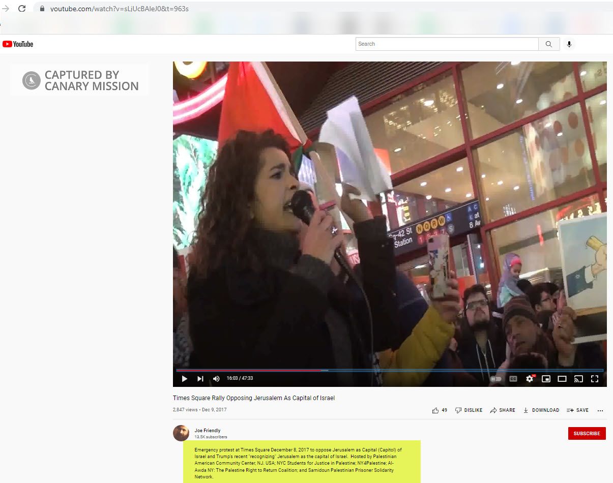 On December 8, 2017, Deek said [00:16:03] at an anti-Israel rally: “It is the Intifada that will bring peace here in the U.S.! Long live the Intifada! Long live the Intifada!”Since the early 2000s, the term “intifada,” which translates from Arabic as “uprising” or “insurrection,” has carried the connotation of violence.