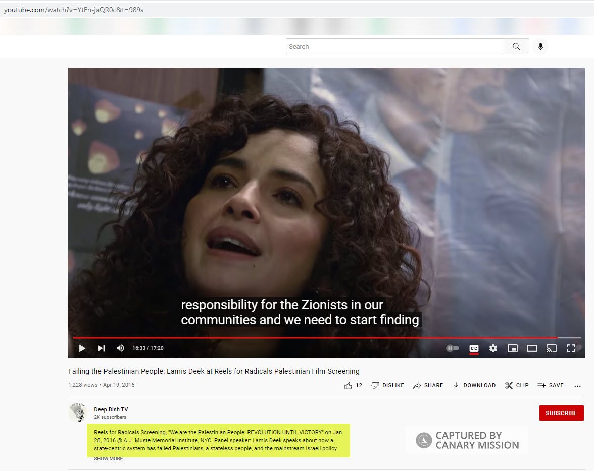 On April 16, 2022, Deek featured [00:01:41] in an Al-Awda NY Twitter video where she said: “What drives Israel drives all oppression in the world!”