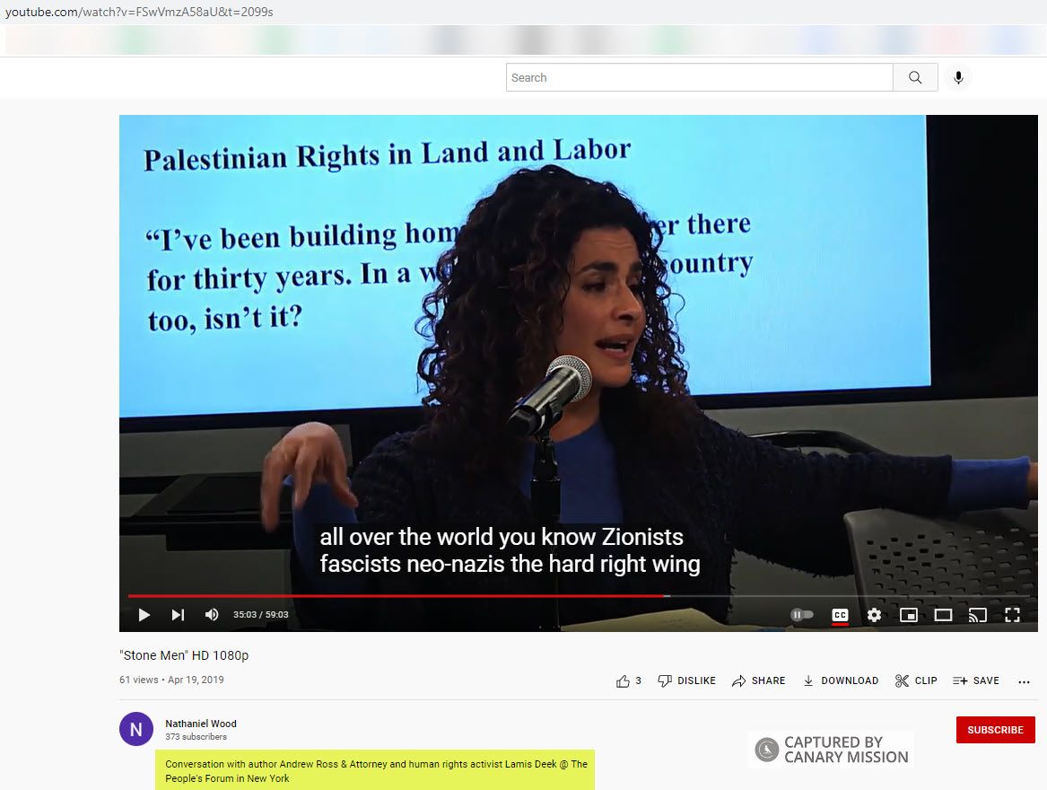 On March 27, 2019, Deek referred to [00:34:54] a “stark polarization that we’re seeing happen all over the world…Zionist, fascists, Neo-Nazis…on one end; and those who are fighting for black lives…and Palestine, and justice, and humanity, and for human and global morality on the other end.”