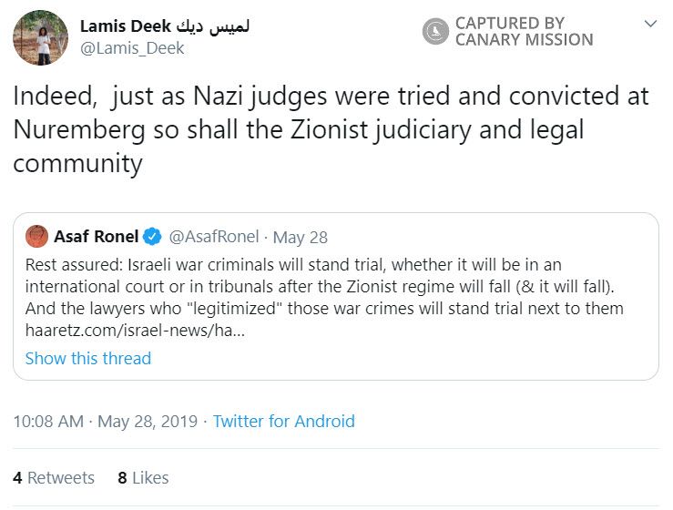 On August 26, 2019, Deek tweeted: “...Israel is a key obstacle to regional peace and self/democratic rule, and a key obstacle to efforts toward global peace.”