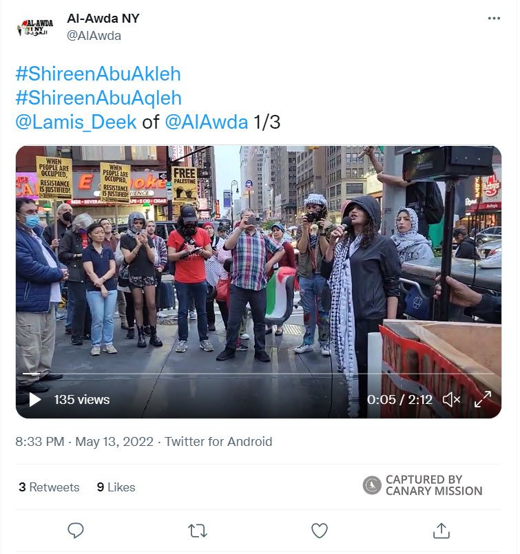On May 13, 2022, Deek featured [00:01:21] in an Al-Awda NY Twitter video where she said: “We love Hamas, and the PFLP, and Islamic Jihad…They are global, global heroes of the fight against imperialism. They are global agents of world peace. They are global agents of progress and humanity!”