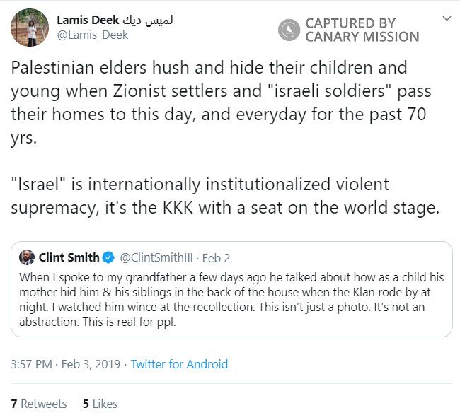 On February 3, 2019, Deek tweeted: “...‘Israel’ is internationally institutionalized violent supremacy, it’s the KKK with a seat on the world stage.”