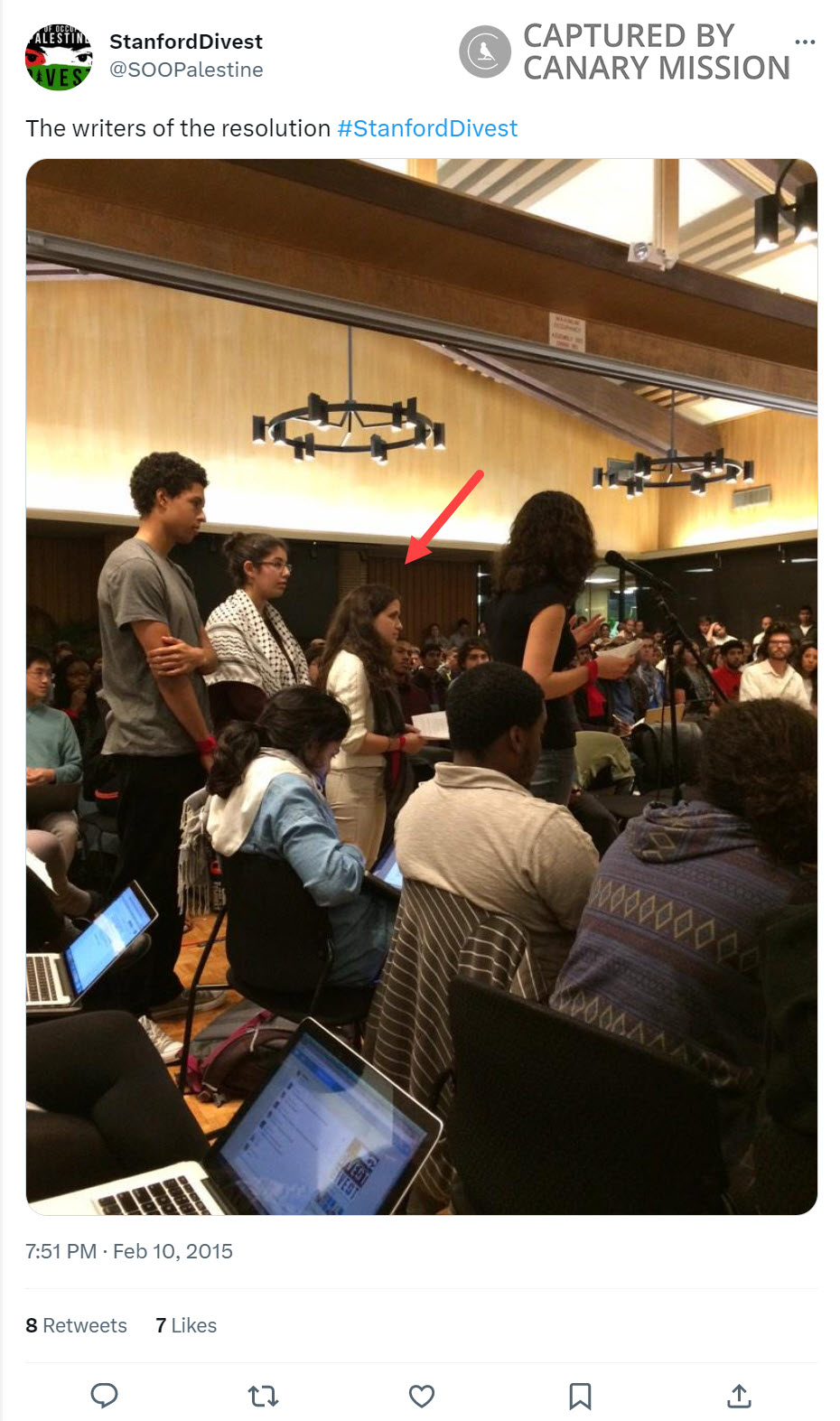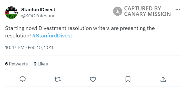 On February 3, 2015, the Associated Students of Stanford University (ASSU) Undergraduate Senate reportedly met to discuss SOOP’s petition. The petition called on the ASSU and Stanford Board of Trustees to divest from companies that it claimed were “complicit in the infrastructure of occupation, collective punishment, state-sponsored repression, and unjust incarceration in Palestine.”