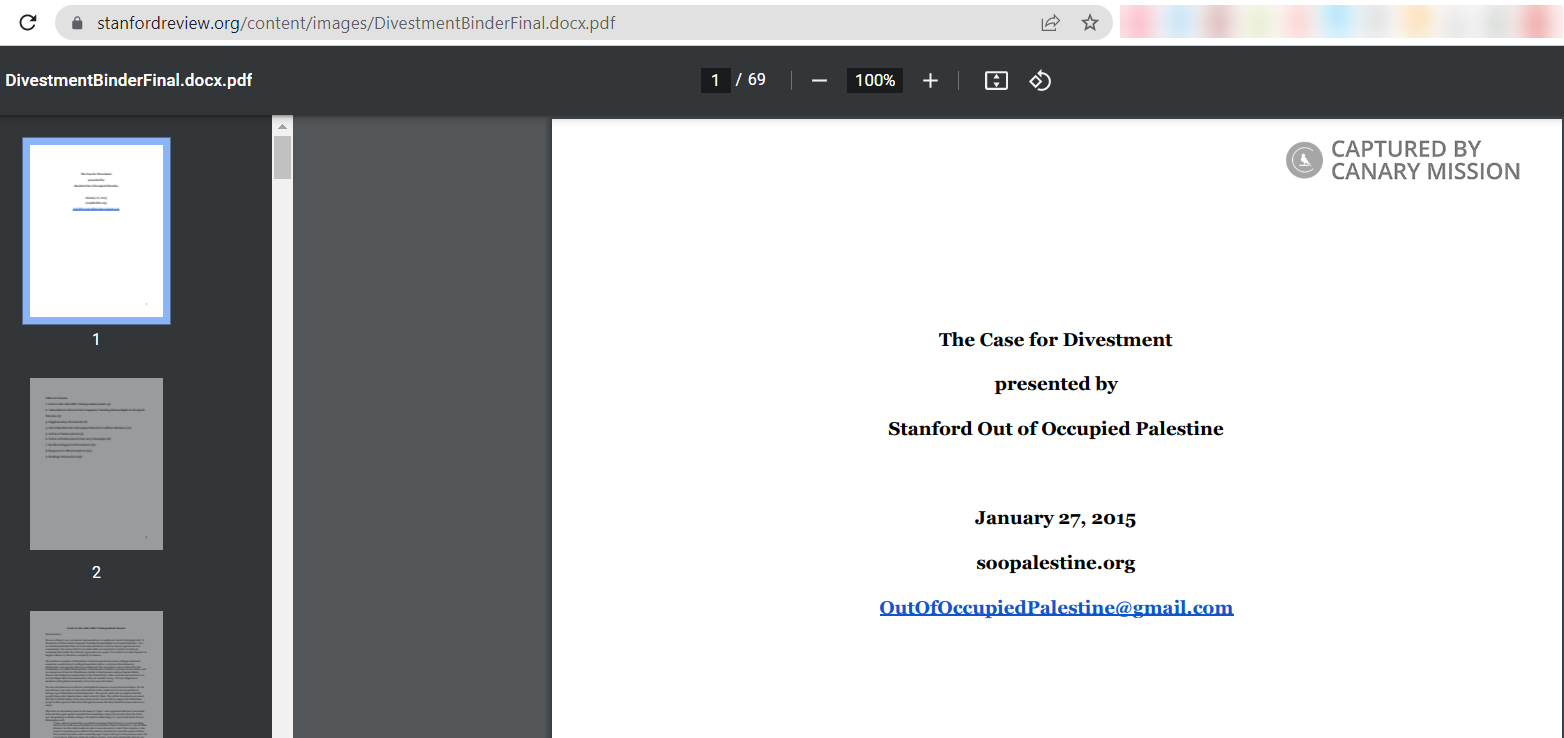 In January 2015, Perez co-authored an anti-Israel divestment resolution presented by SOOP and initiated [00:12:16] by Stanford SJP, titled: “A Resolution to Divest from Companies Violating Human Rights in Occupied Palestine.” The resolution was the culmination of a six-week SOOP divestment campaign.The resolution called [p. 7] on Stanford “to dissociate itself from systematic oppression by divesting from companies that participate in human rights violations against…the Occupied Palestinian Territories.”