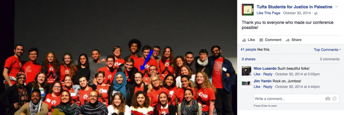 On October 23, 2014, Muskin-Pierret was reported to be the “logistics point person” for the 2014 National SJP Conference at Tufts. Freedman also helped Tufts SJP raise money to bring students from other campuses to the conference.